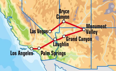 Hoje passearemos pelo Joshua National Park. Desfrute das belas cores e formações rochosas. Na “Twentynine Palms” a sua viagem se torna uma lenda pois entraremos na Historic Route 66 em Amboy. Este será o nosso caminho até Laughlin. Cruzaremos a divisa estadual e entraremos em Nevada até chegarmos a Laughlin para este pernoite.